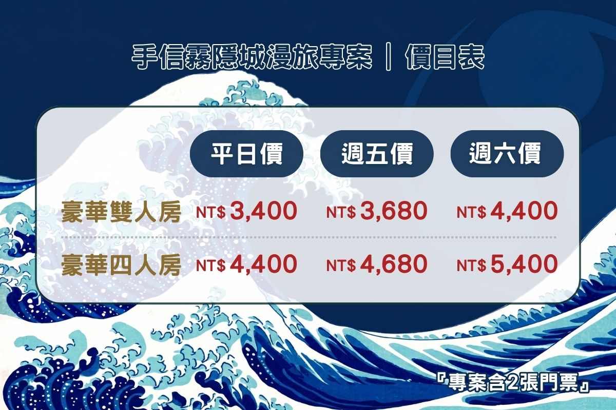 ※本專案僅包含2張成人票,需購買其餘門票請於手信霧隱現場加購。